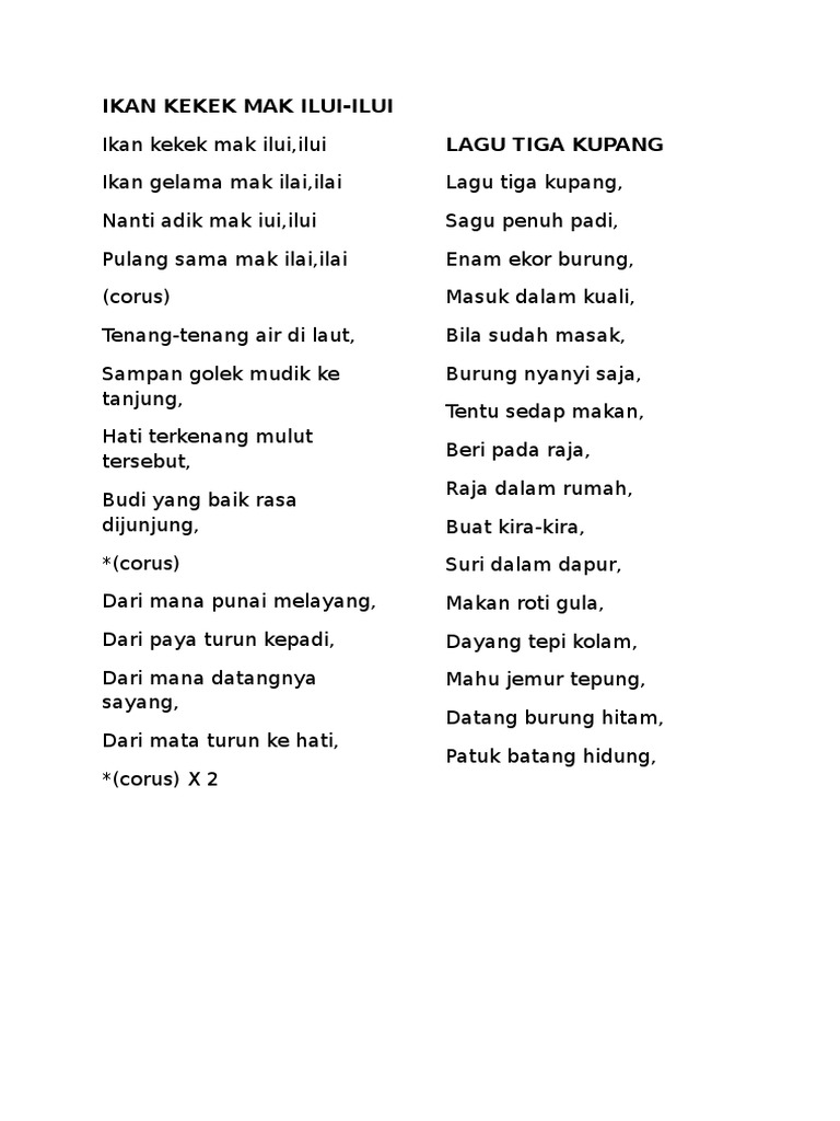 We should not follow blindly what other people are doing as it will finally cause us. May 01, 2020 · the lyrics often tells a story or bear advice which are intended for young people, although some are humorously written and are meant to entertain. Instead, we should try to improve ourselves first. Ikan kekek mak iloi iloi / ikan gelama mak ilai ilai / hujan emas di n. "ikan kekek" is about a fish, and a whole lot more!