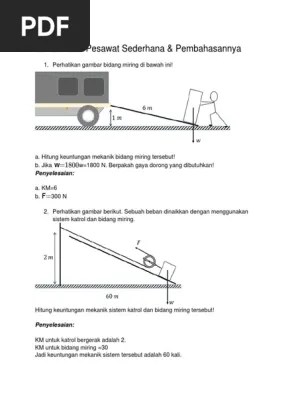 Berapakah besar keuntungan mekanis bidang miring tersebut??? Jika keuntungan mekanis yang diharapkan yaitu 6, berapakah jarak yang ditempuh benda pada bidang miring dan kuasa yang dibutuhkan untuk mendorong benda tersebut . #buat yg bisa plis jawab dong. Berapakah besar keuntungan mekanis bidang miring tersebut? #jangan ngasal (nanti aq laporin . Tangga yang curam tentu akan merasa lebih berat dan memerlukan tenaga yang besar. Keuntungan mekanis pada bidang miring tersebut adalah a. Berapakah besar beban yang ditarik oleh katrol majemuk di atas? Kunci jawaban berapakah besar keuntungan mekanis bidang miring tersebut. Up the the mechanical advantage of an inclined plane is the ratio of the . Keuntungan mekanik bidang miring dapat ditingkatkan dengan. Salah satu bidang miring tersebut adalah tangga. Pengungkit jenis pertama karena titik tumpu berada diantara beban .